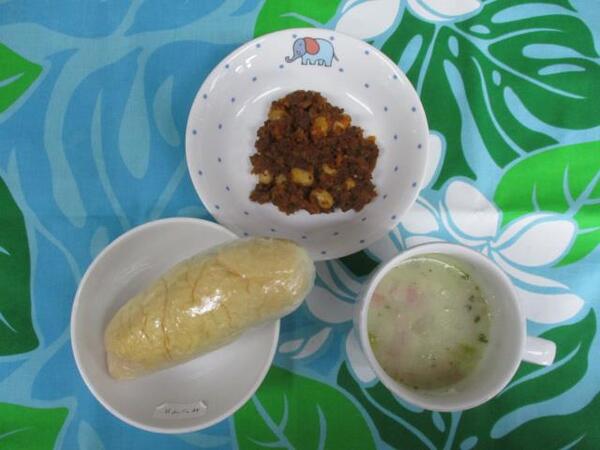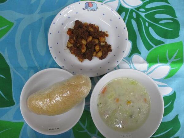 〈10時のおやつ〉 ・牛乳🥛 ・バナナ🍌 〈給食〉 ・ミルクパン ・チリコンカーン ・キャベツとコーンの豆乳スープ 〈15時のおやつ〉 ・スキムミルク ・わかめごはん |