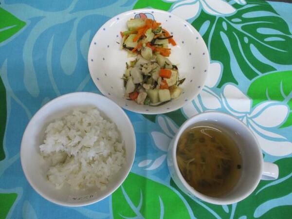 〈10時のおやつ〉 ・牛乳🥛 ・もも缶 〈給食〉 ・麦ごはん ・すまし汁(未満児のみ) ・鳴門煮 ・塩昆布炒め 〈15時のおやつ〉 ・飲むヨーグルト ・きな粉パン |