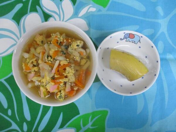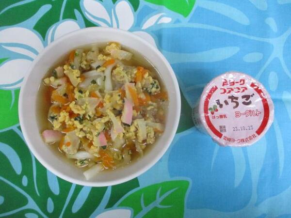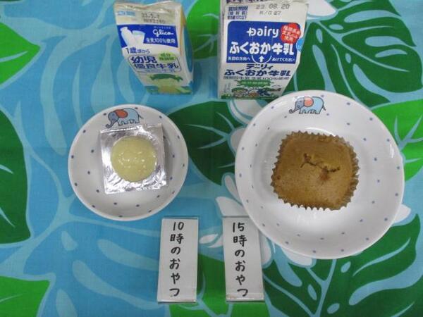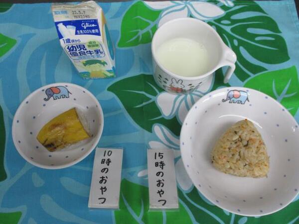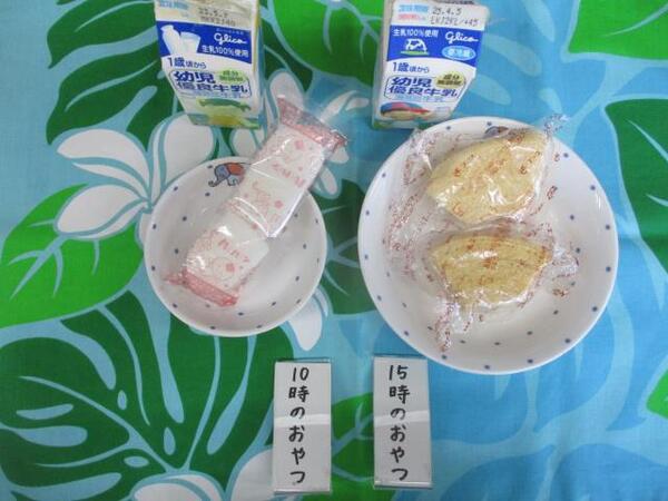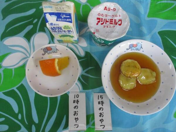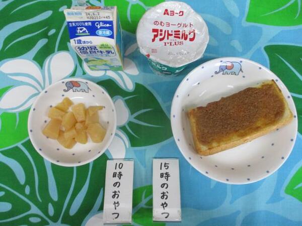 〈10時のおやつ〉 ・牛乳 ・せんべい 〈給食〉 ・親子うどん ・バナナ(未満児) ・ヨーグルト(以上児) 〈15時のおやつ〉 ・牛乳 ・バームクーヘン |