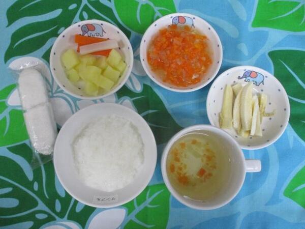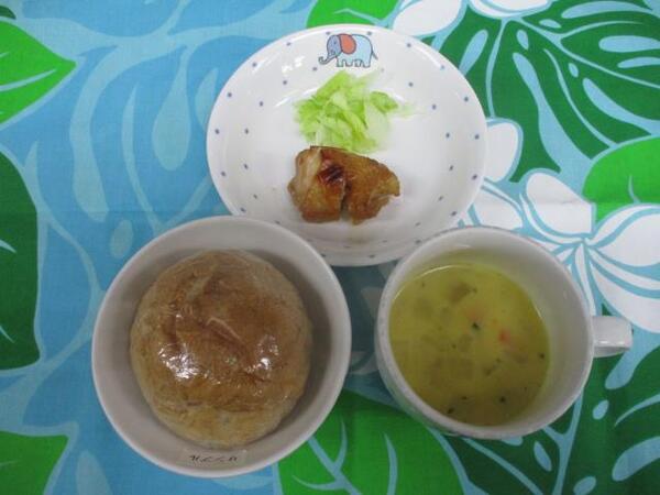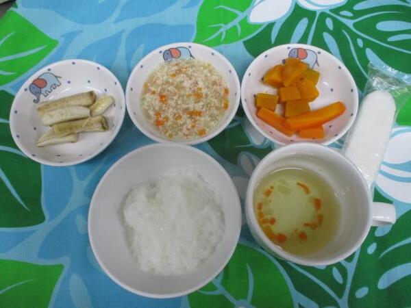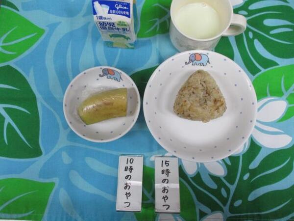 | 〈10時のおやつ〉 ・牛乳🥛 ・バナナ🍌 〈給食〉 ・ミルクパン ・鶏のマーマレード焼き ・レタス ・かぼちゃスープ 〈15時のおやつ〉 ・スキムミルク ・きのこご飯 |