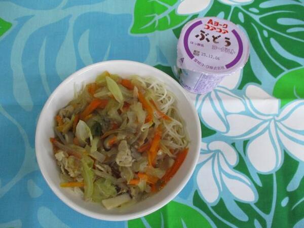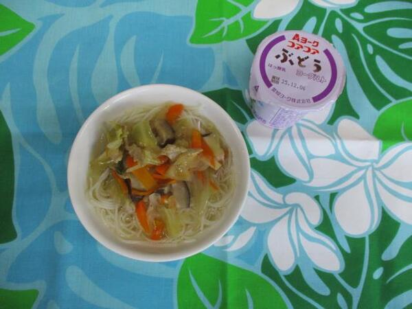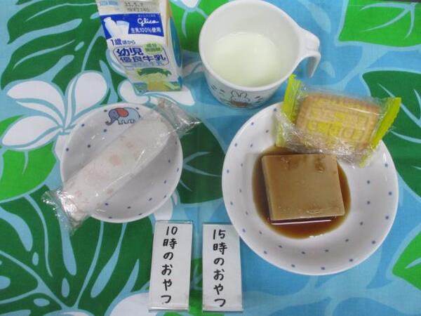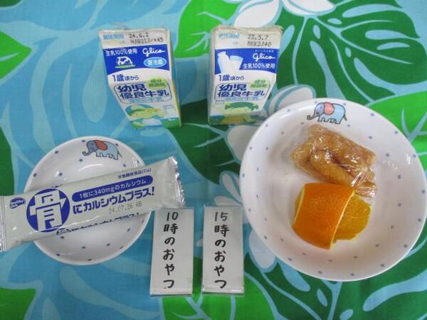 | 〈10時のおやつ〉 ・牛乳🥛 ・ウエハース 〈給食〉 ・汁ビーフン ・ヨーグルト 〈15時のおやつ〉 ・牛乳 ・オレンジ🍊 ・かりんとう |