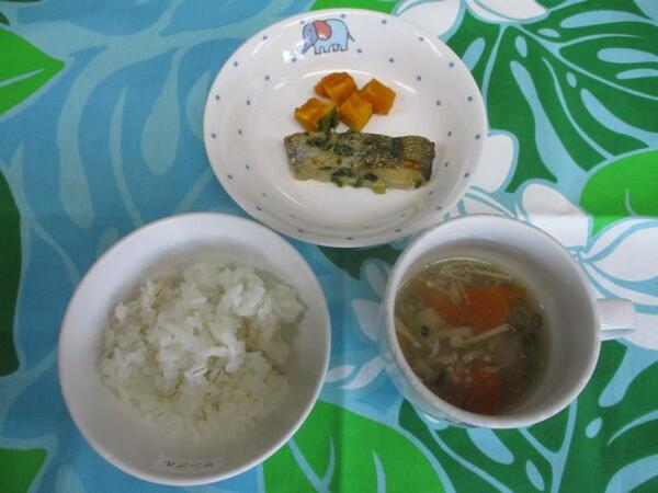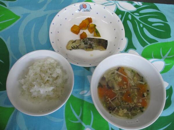 | 〈10時のおやつ〉 ・牛乳🥛 ・オレンジ🍊 〈給食〉 ・麦ごはん ・魚の香味焼き ・焼きかぼちゃ ・中華スープ 〈15時のおやつ〉 ・牛乳🥛 ・小倉蒸しパン |