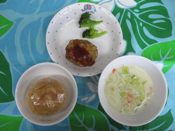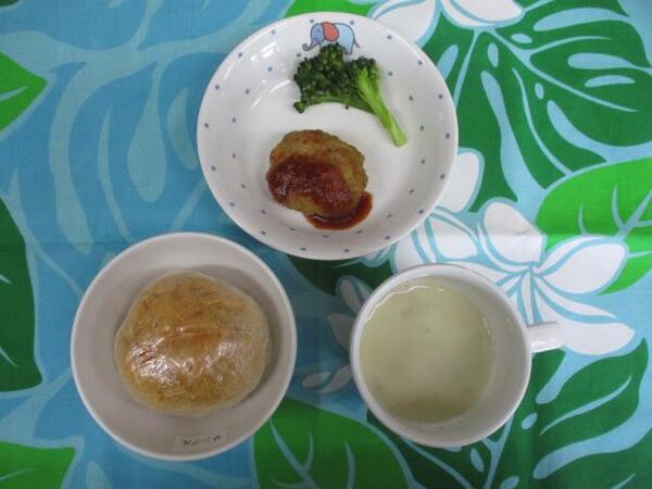| 〈10時のおやつ〉 ・牛乳🥛 ・チーズ🧀 〈給食〉 ・パンプキンパン ・ハンバーグ ・ブロッコリー ・キャベツとコーンの豆乳スープ 〈15時のおやつ〉 ・豆乳 ・人参ゼリー ・チーズ🧀(以上児のみ) |
