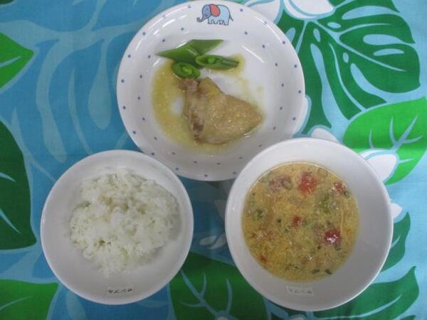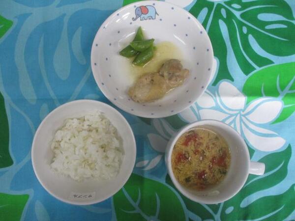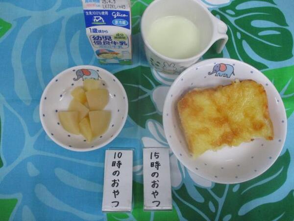 | 〈10時のおやつ〉 ・牛乳🥛 ・もも缶🍑 〈給食〉 ・麦ごはん ・鶏肉のさっぱり煮 ・スナップえんどう ・卵とトマトのかきたま汁 〈15時のおやつ〉 ・スキムミルク ・チーズトースト |