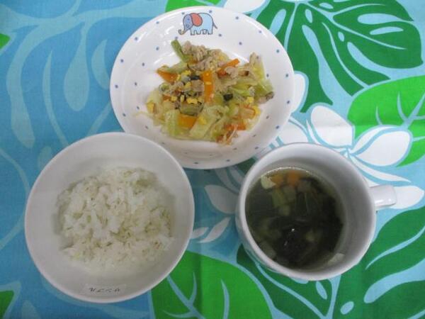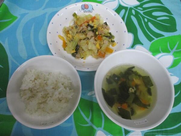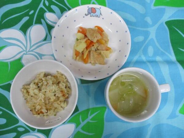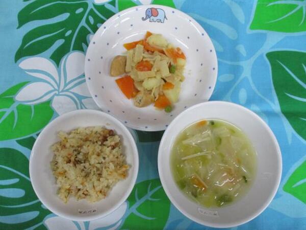 | 〈10時のおやつ〉 ・牛乳🥛 ・パイン缶🍍 〈給食〉 ・麦ごはん ・雑菜 ・鶏肉とコロコロ野菜の清汁 〈15時のおやつ〉 ・スキムミルク ・ココアゼリー |