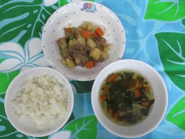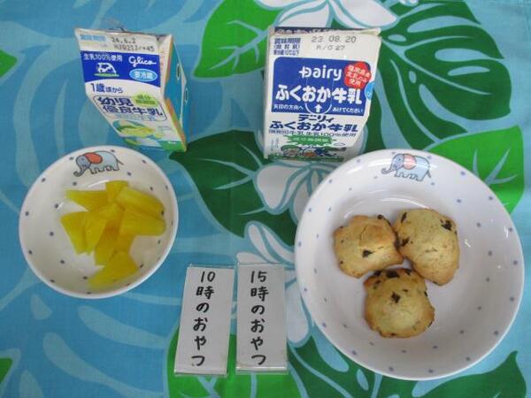 〈10時のおやつ〉 ・牛乳🥛 ・パイン缶🍍 〈給食〉 ・麦ごはん ・肉じゃが ・わかめスープ 〈15時のおやつ〉 ・牛乳🥛 ・レーズンクッキー |
