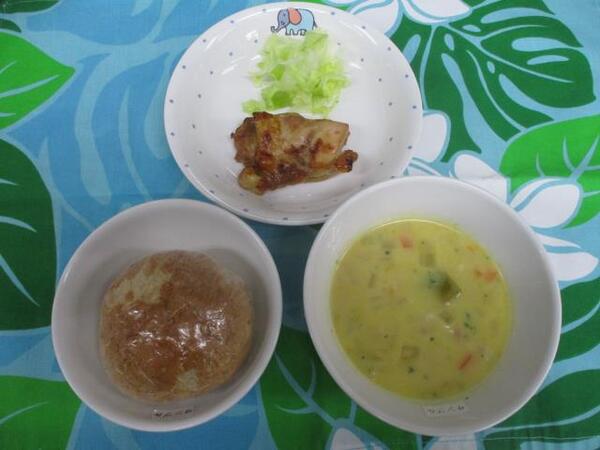 | 〈10時のおやつ〉 ・牛乳🥛 ・せんべい 〈給食〉 ・ロールパン ・ミートローフ ・ゆでブロッコリー🥦 ・チキンスープ 〈15時のおやつ〉 ・スキムミルク ・マカロニのきな粉和え |