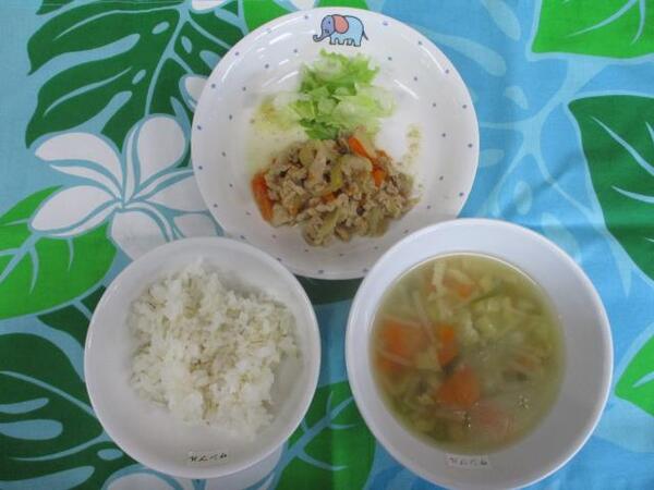| 〈10時のおやつ〉 ・牛乳🥛 ・せんべい 〈給食〉 ・麦ごはん ・豚肉の生姜焼き ・レタス ・シャッキリ味噌汁 〈15時のおやつ〉 ・スキムミルク ・きな粉よせ ・クッキー |
