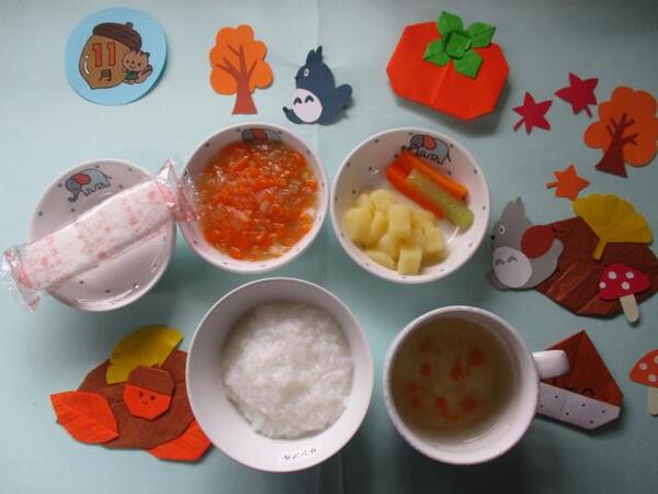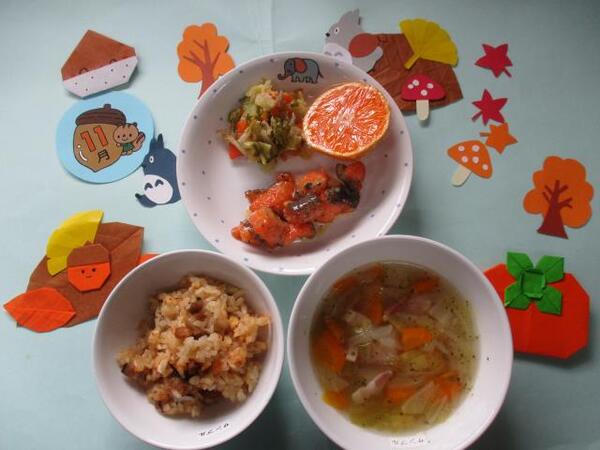 | 〈10時のおやつ〉 ・牛乳🥛 ・せんべい 〈給食〉 ・かぼちゃパン ・ポトフ ・切り干し大根の味噌マヨネーズ和え 〈15時のおやつ〉 ・スキムミルク ・こぎつねごはん 以上児のみ柿 |