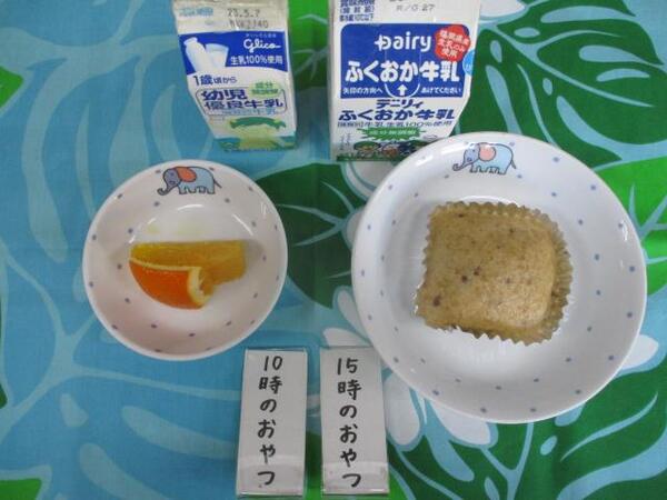 | 〈10時のおやつ〉 ・牛乳🥛 ・オレンジ🍊 〈給食〉 ・わかめご飯 ・がんもどきの炊き合わせ ・大根のみそ汁 〈15時のおやつ〉 ・飲むヨーグルト ・人参カップケーキ🥕 |