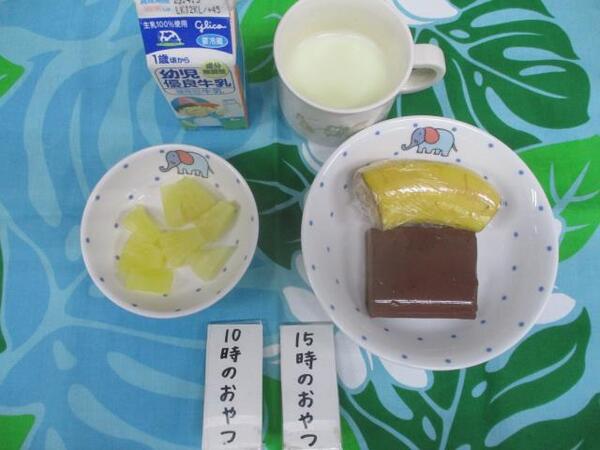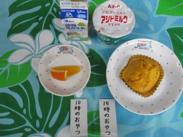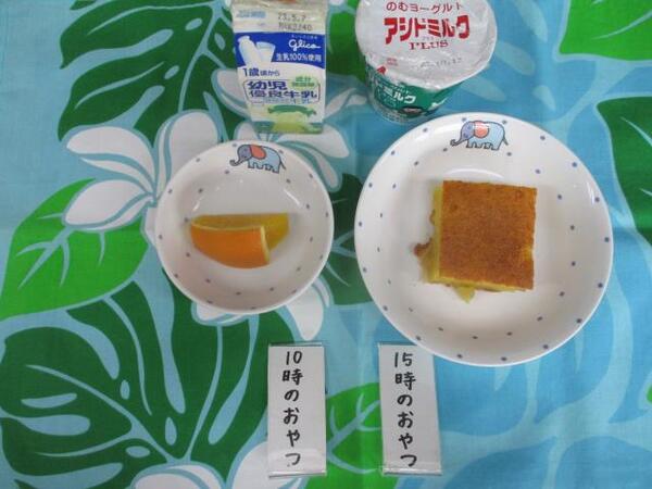 | 〈10時のおやつ〉 ・牛乳🥛 ・オレンジ🍊 〈給食〉 ・麦ごはん ・魚の照り焼き ・いんげん ・のっぺい汁 〈15時のおやつ〉 ・飲むヨーグルト ・パイナップルケーキ |