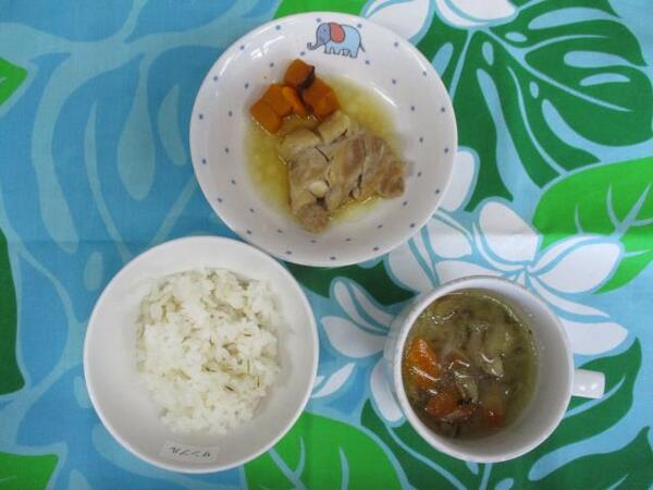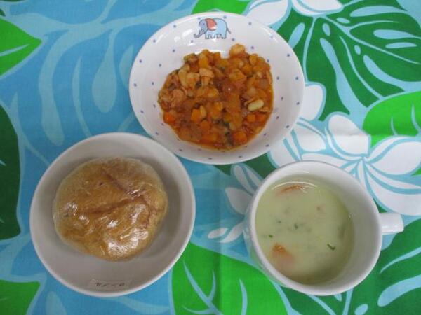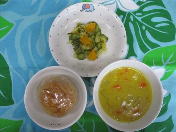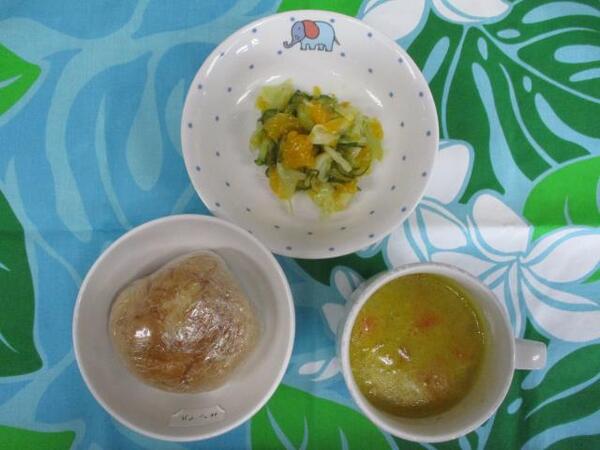 | 〈10時のおやつ〉 ・牛乳🥛 ・せんべい 〈給食〉 ・バターロール ・鶏肉とかぼちゃのカレークリームシチュー ・オレンジサラダ 〈15時のおやつ〉 ・スキムミルク ・キウイ🥝 ・ウエハース |
