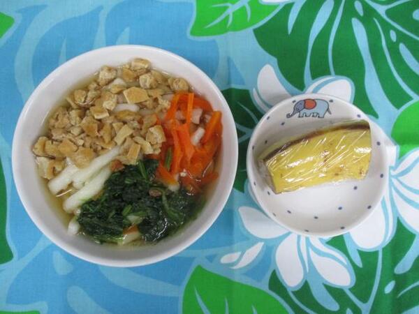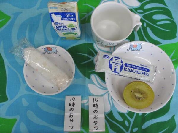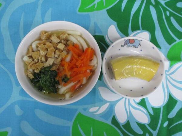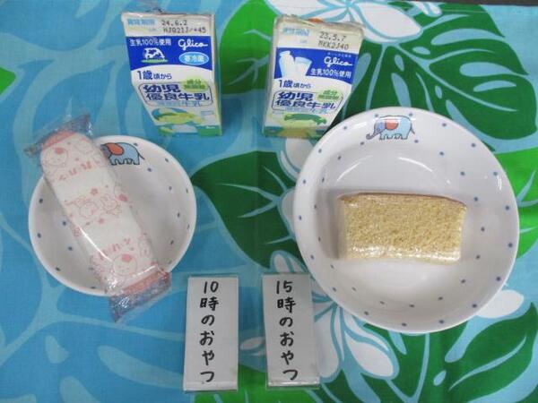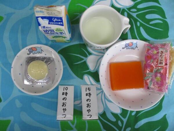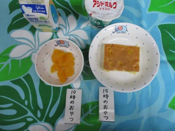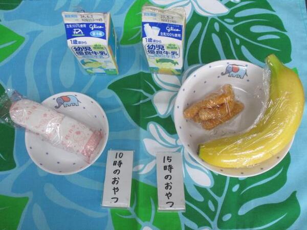 | 〈10時のおやつ〉 ・牛乳🥛 ・せんべい 〈給食〉 ・きつねうどん ・バナナ🍌 〈15時のおやつ〉 ・牛乳🥛 ・カステラ |