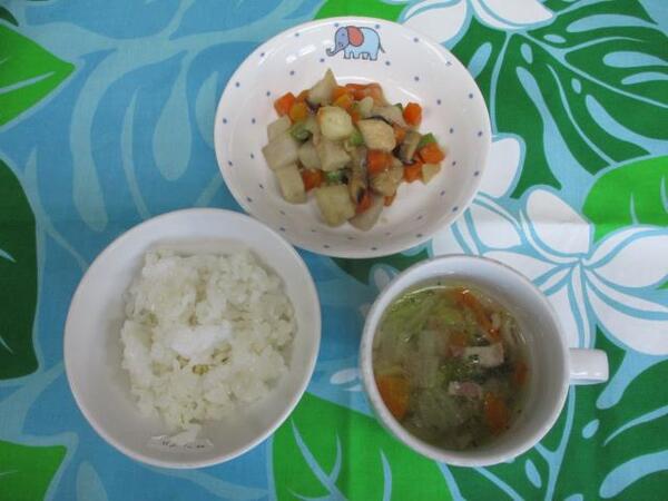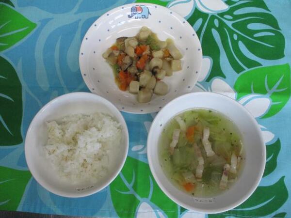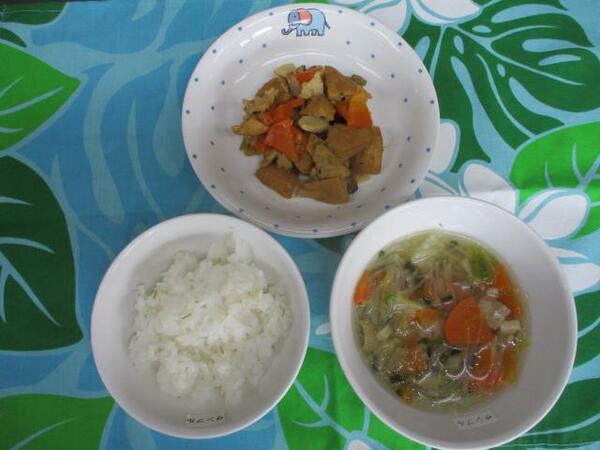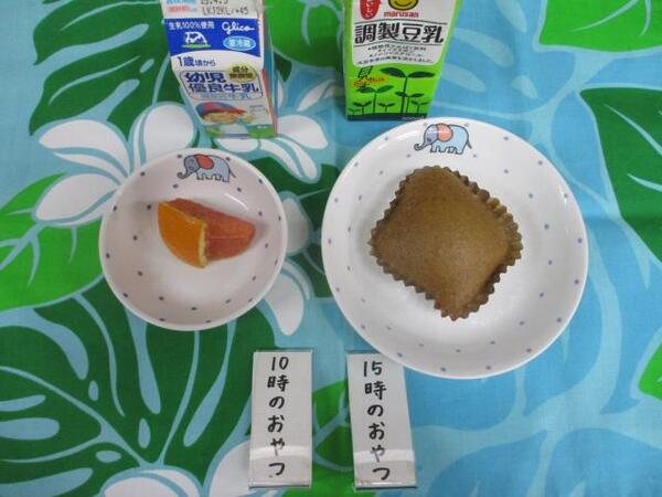 | 〈10時のおやつ〉 ・牛乳🥛 ・オレンジ🍊 〈給食〉 ・麦ごはん ・がんもどきの中華風うま煮 ・白菜と春雨のスープ 〈15時のおやつ〉 ・豆乳 ・マーラカオ |