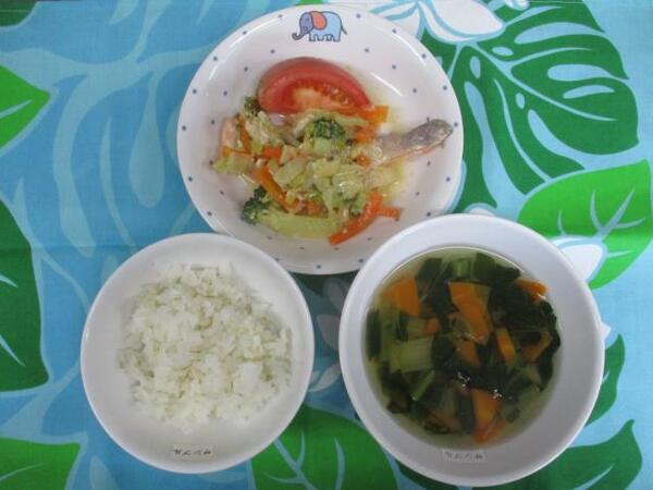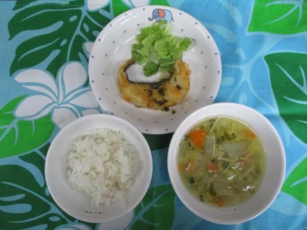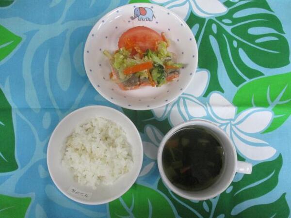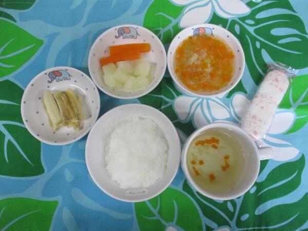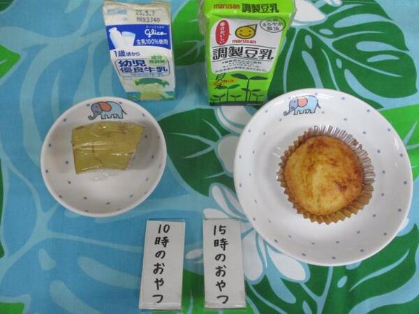 | 〈10時のおやつ〉 ・牛乳🥛 ・バナナ🍌 〈給食〉 ・麦ごはん ・鮭のチャンチャン焼き ・トマト ・春雨スープ 〈15時のおやつ〉 ・豆乳 ・おからマフィン |