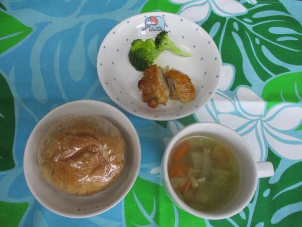 | 〈10時のおやつ〉 ・牛乳🥛 ・もも缶🍑 〈給食〉 ・白パン ・タンドリーチキン🍗 ・ゆでブロッコリー🥦 ・白菜とベーコンのスープ 〈15時のおやつ〉 ・牛乳🥛 ・おからスコーン |