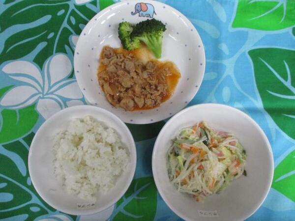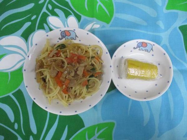 | 〈10時のおやつ〉 ・牛乳🥛 ・もも缶🍑 〈給食〉 ・麦ごはん ・すまし汁(未満児のみ) ・ポークチャップ ・ゆでブロッコリー🥦 ・春雨サラダ 〈15時のおやつ〉 ・スキムミルク ・ふかし芋🍠 |