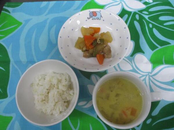 | 〈10時のおやつ〉 ・牛乳🥛 ・パイン缶 〈給食〉 ・麦ごはん ・魚のかば焼き風 レタス ・ミネストローネスープ 〈15時のおやつ〉 ・スキムミルク ・黒糖豆乳ゼリー |