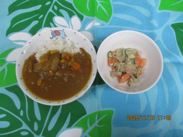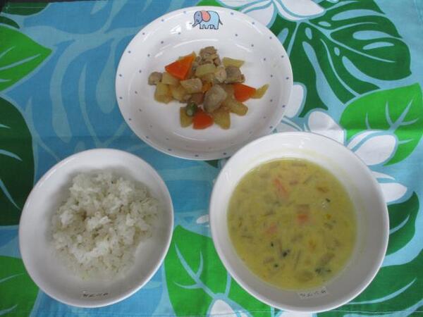 | 〈10時のおやつ〉 ・牛乳🥛 ・チーズ🧀 〈給食〉 ・麦ごはん ・カレー ・ごぼうサラダ 〈15時のおやつ〉 ・スキムミルク ・みかん🍊 ・クラッカー |