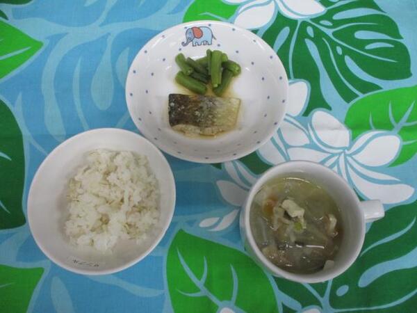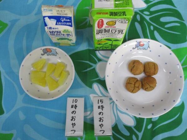 | 〈10時のおやつ〉 ・牛乳🥛 ・パイン缶🍍 〈給食〉 ・麦ごはん ・魚のみそ煮 ・いんげん ・豚汁 〈15時のおやつ〉 ・豆乳 ・きな粉米粉ボーロ |