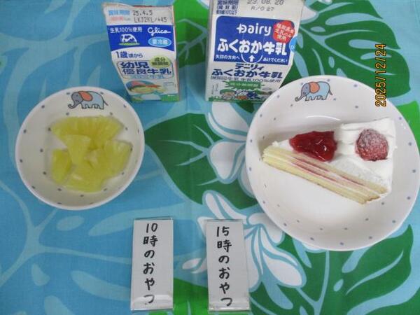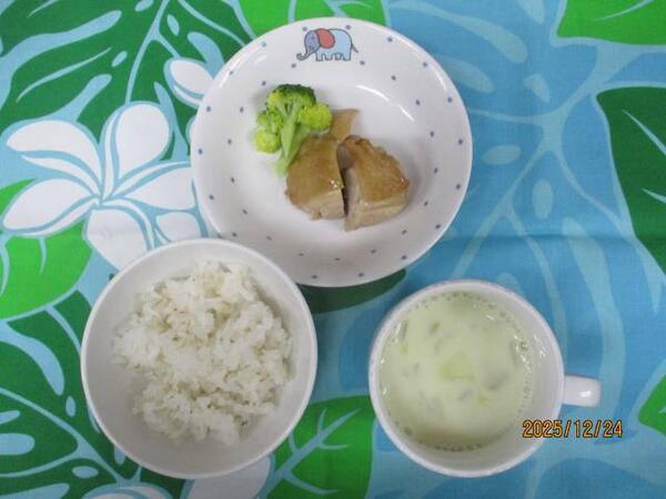 | 〈10時のおやつ〉 ・牛乳🥛 ・パイン缶🍍 〈給食〉 ・麦ごはん ・ローストチキン ・ゆでブロッコリー🥦 ・キャベツとコーンの豆乳スープ 〈15時のおやつ〉 ・牛乳🥛 ・ケーキ🍰 |