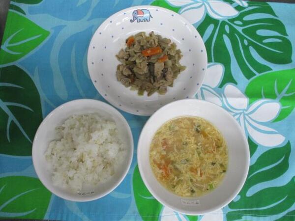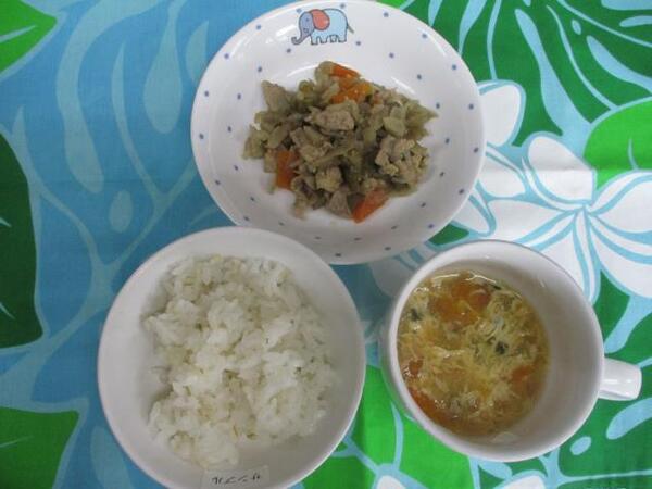 | 〈10時のおやつ〉 ・牛乳🥛 ・もも缶🍑 〈給食〉 ・麦ごはん ・豚肉とごぼうの甘辛煮 ・卵とトマトのかきたま汁 〈15時のおやつ〉 ・ミルクココア ・みかん🍊 ・あられ |