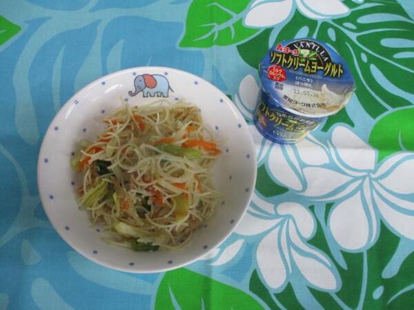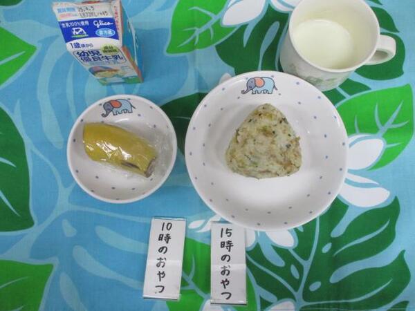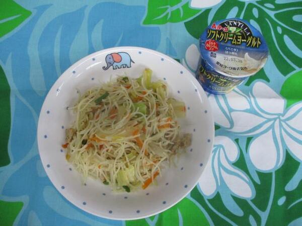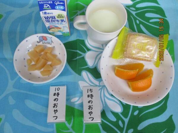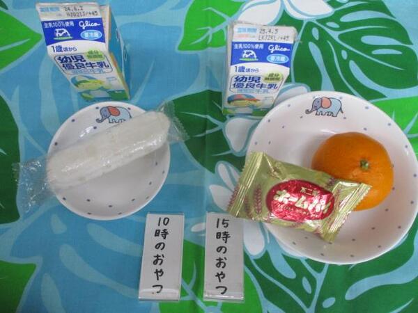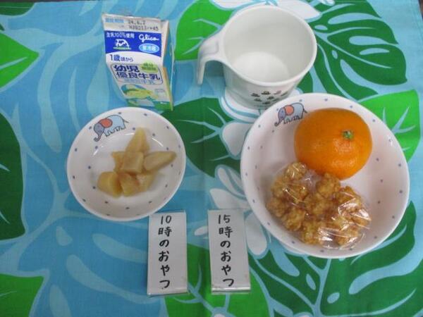 | 〈10時のおやつ〉 ・牛乳🥛 ・せんべい 〈給食〉 ・焼きビーフン ・ヨーグルト 〈15時のおやつ〉 ・牛乳 ・みかん🍊 ・パイ |