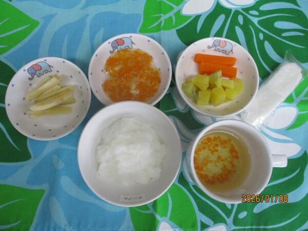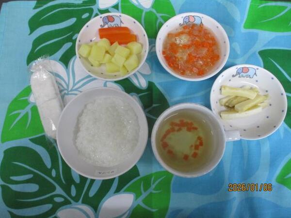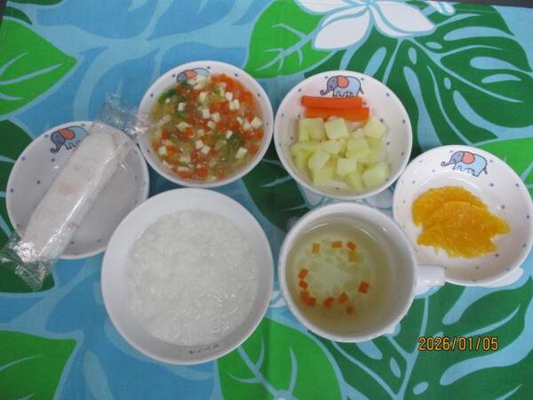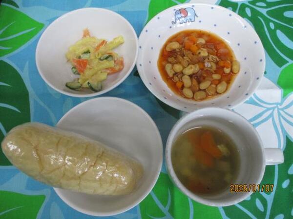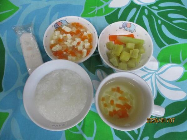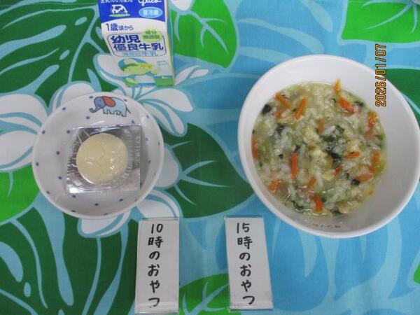 | 〈10時のおやつ〉 ・牛乳🥛 ・チーズ🧀 〈給食〉 ・ミルクパン ・コンソメスープ ・ポークビーンズ ・マカロニとツナのサラダ 〈15時のおやつ〉 ・七草がゆ ・チーズ🧀(以上児のみ) |