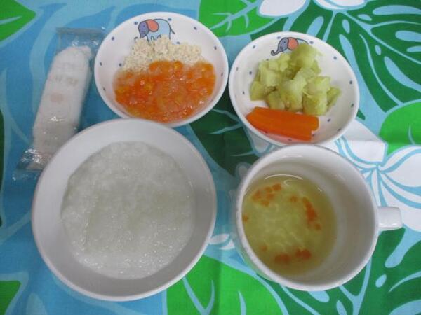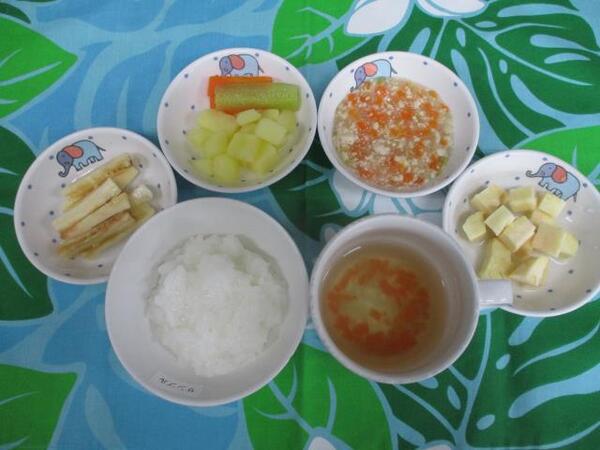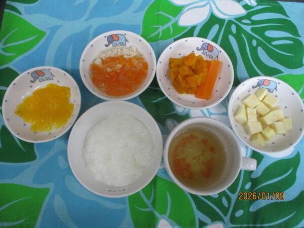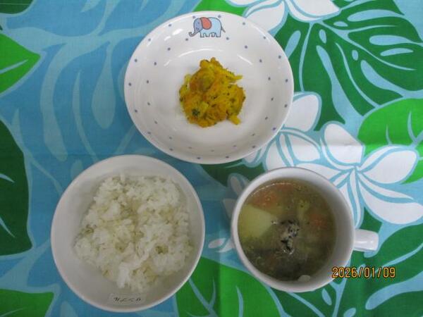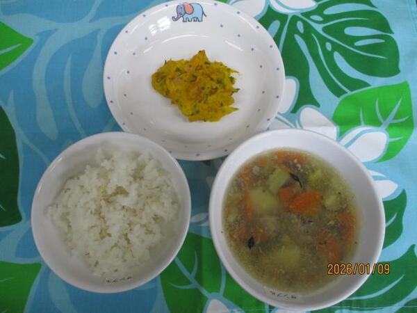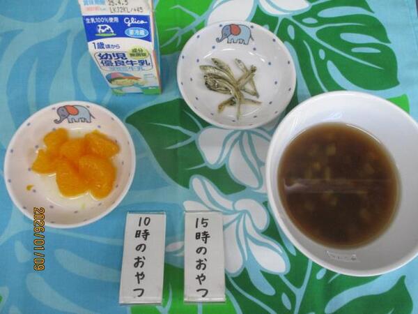 | 〈10時のおやつ〉 ・牛乳🥛 ・みかん缶🍊 〈給食〉 ・麦ごはん ・ひじき団子のスープ ・かぼちゃサラダ 〈15時のおやつ〉 ・いもぜんざい ・いりいりこ(以上児のみ】 |