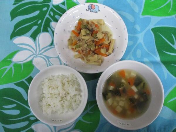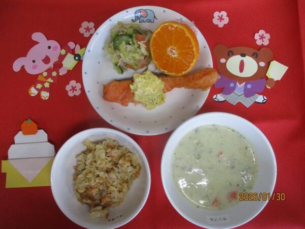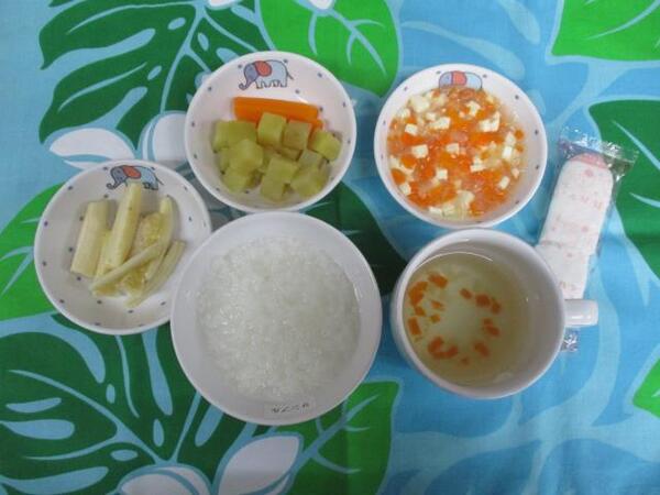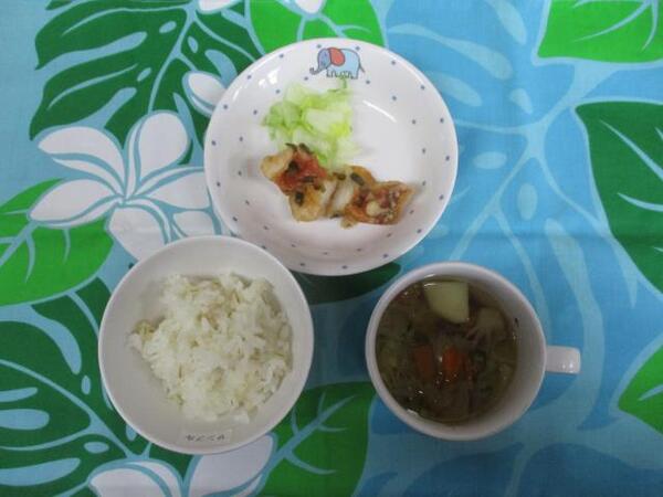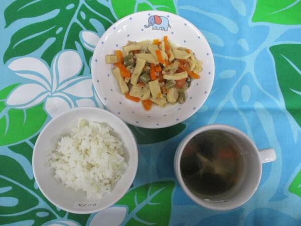 | 〈10時のおやつ〉 ・牛乳🥛 ・もも缶🍑 〈給食〉 ・麦ごはん ・魚の竜田揚げ ・レタス ・キャベツとコーンの豆乳スープ 〈15時のおやつ〉 ・ラッシー ・黒糖ゼリー |