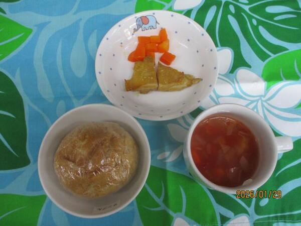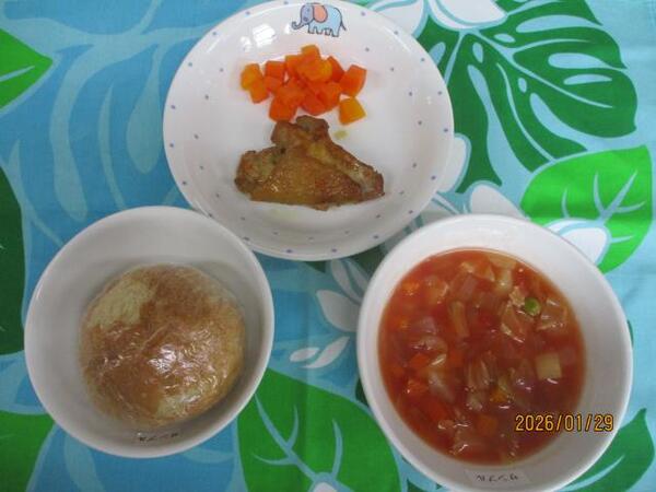 | 〈10時のおやつ〉 ・牛乳🥛 ・みかん缶🍊 〈給食〉 ・かぼちゃパン ・ローストチキン ・人参の甘煮🥕 ・ミネストローネスープ 〈15時のおやつ〉 ・豆乳 ・バスブーサ |