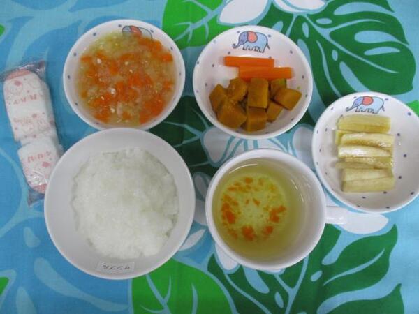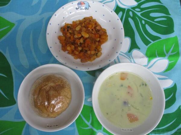| 〈10時のおやつ〉 ・牛乳🥛 ・バナナ 〈給食〉 ・パンプキンパン ・ポークビーンズ ・きのこと豆乳のコーンスープ 〈15時のおやつ〉 ・スキムミルク ・キャロットご飯 |