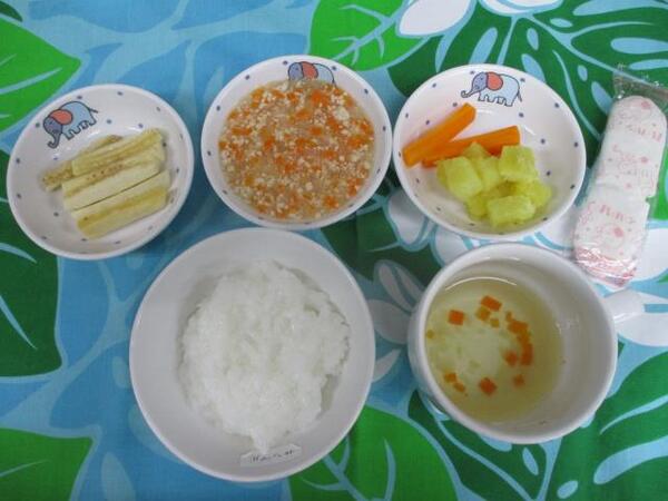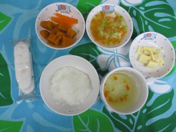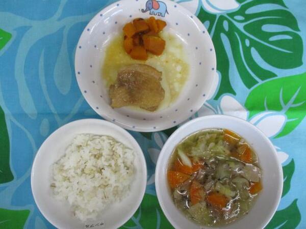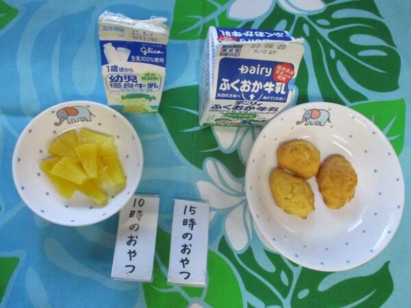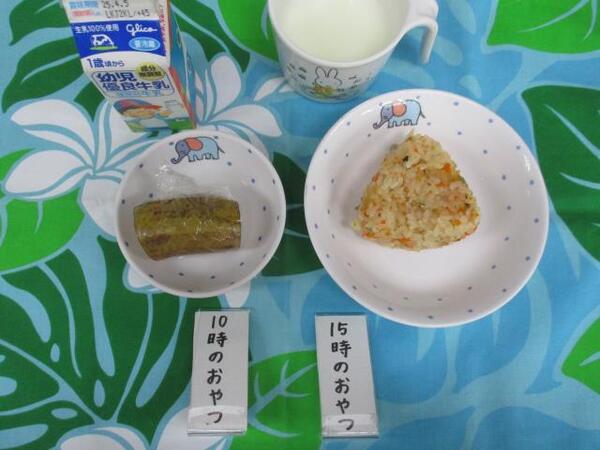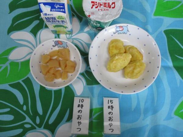 | 〈10時のおやつ〉 ・牛乳🥛 ・もも缶 〈給食〉 ・麦ごはん ・鶏肉のさっぱり煮 ・焼きかぼちゃ ・野菜スープ 〈15時のおやつ〉 ・飲むヨーグルト ・さつま芋の天ぷら 15時のおやつのさつま芋の天ぷらは芋ほり遠足のお芋を使いました。 |