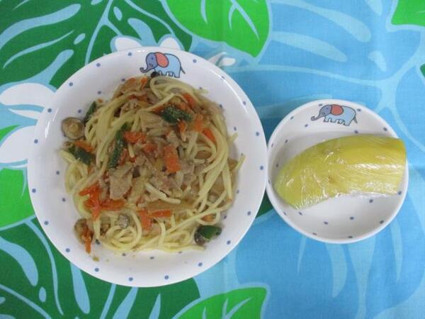 | 〈10時のおやつ〉 ・牛乳🥛 ・バナナ🍌 〈給食〉 ・麦ごはん ・鶏肉とだいこんの煮物 ・かぼちゃの豆乳味噌スープ 〈15時のおやつ〉 ・牛乳🥛 ・ジャージャー麵 |