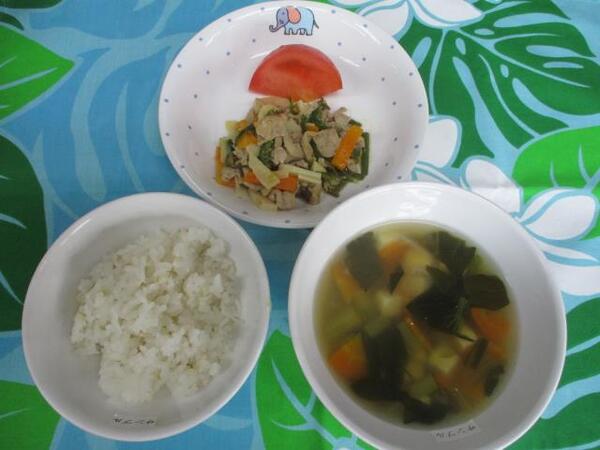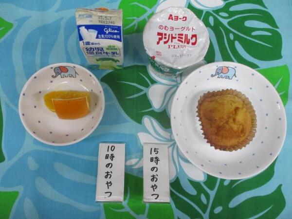 | 〈10時のおやつ〉 ・牛乳🥛 ・オレンジ🍊 〈給食〉 ・麦ごはん ・豚肉とピーマンの炒め煮 ・トマト🍅 ・豆腐と野菜の清汁 〈15時のおやつ〉 ・飲むヨーグルト ・りんごのカップケーキ🍎 |