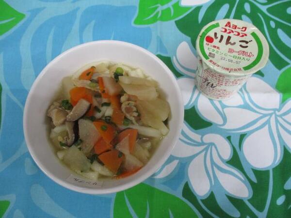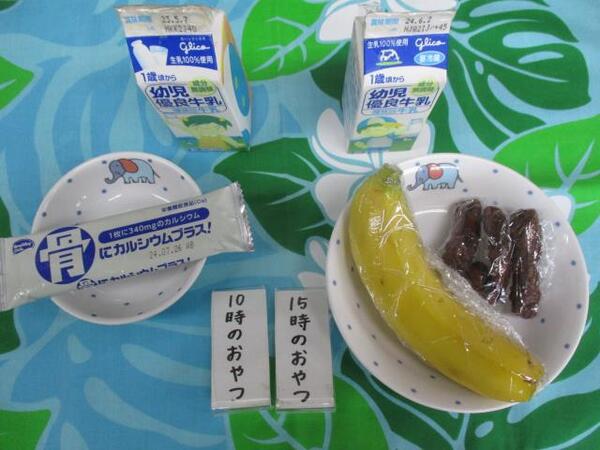 | 〈10時のおやつ〉 ・牛乳🥛 ・ウエハース 〈給食〉 ・みそうどん ・ヨーグルト 〈15時のおやつ〉 ・牛乳 ・バナナ🍌 ・かりんとう |