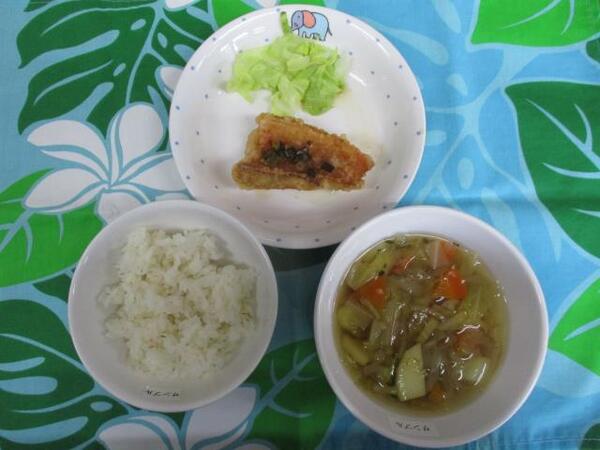 | 〈10時のおやつ〉 ・牛乳🥛 ・せんべい 〈給食〉 ・麦ごはん ・南蛮漬け ・レタス ・野菜スープ 〈15時のおやつ〉 ・スキムミルク ・チーズトースト |