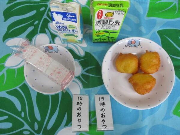| 〈10時のおやつ〉 ・牛乳🥛 ・せんべい 〈給食〉 ・麦ごはん ・がめ煮 ・すまし汁 〈15時のおやつ〉 ・豆乳 ・チーズボール |