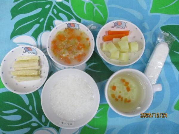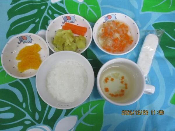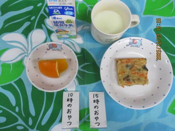| 〈10時のおやつ〉 ・牛乳🥛 ・もも缶🍑 〈給食〉 ・麦ごはん ・厚揚げのみそ煮 ・白菜と春雨のスープ 〈15時のおやつ〉 ・スキムミルク ・オレンジ🍊 ・クッキー |