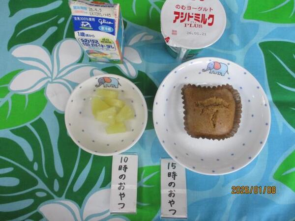 | 〈10時のおやつ〉 ・牛乳🥛 ・せんべい 〈給食〉 ・麦ごはん ・鶏の照り焼き ・レタス ・じゃがいものみそ汁 〈15時のおやつ〉 ・牛乳🥛 ・ココアゼリー ・バナナ🍌 |