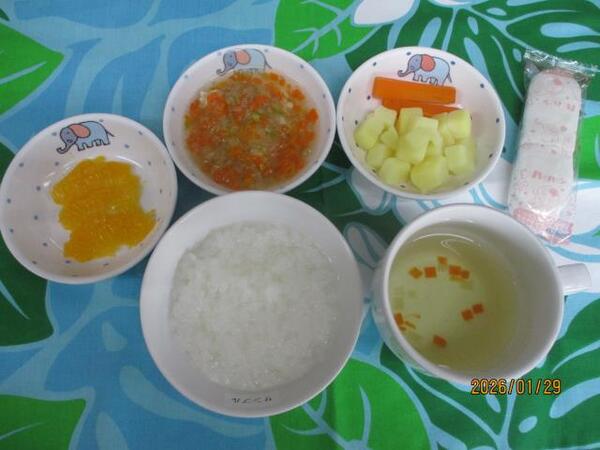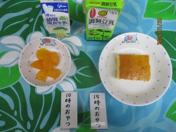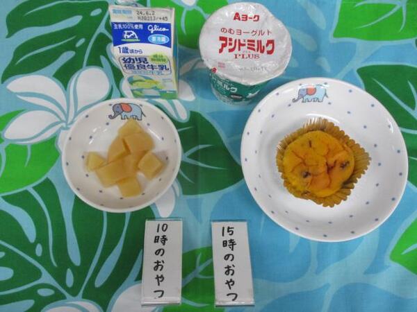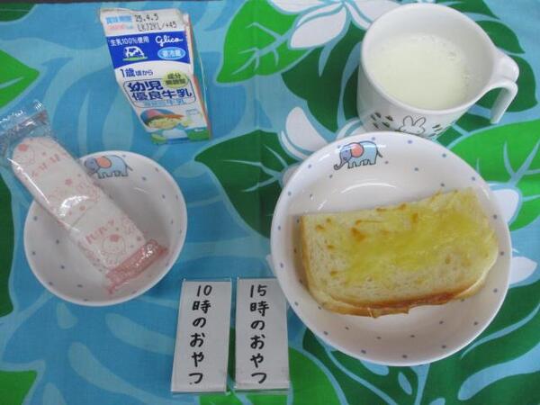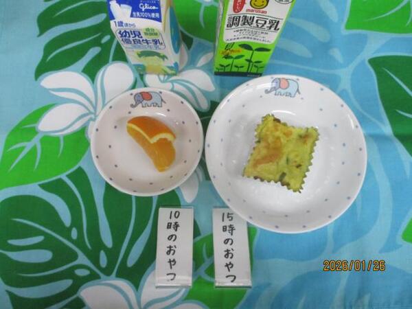 | 〈10時のおやつ〉 ・牛乳🥛 ・チーズ🧀 ・白パン ・チリコンカーン ・ポテトミルクスープ 〈15時のおやつ〉 ・ホワイトミルク ・みかん🍊 ・あられ |