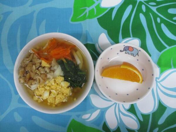| 〈10時のおやつ〉 ・牛乳🥛 ・せんべい 〈給食〉 ・きつねうどん ・オレンジ🍊 〈15時のおやつ〉 ・牛乳 ・カステラ |