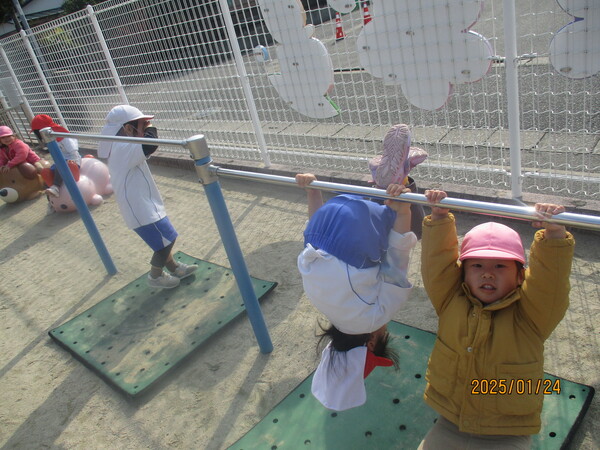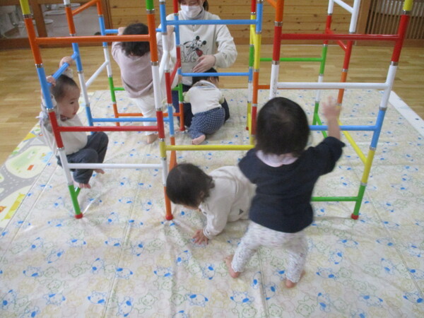 | なかなかスッキリ晴れずな1週間ですね⛅今日はお部屋でコーナー遊びをしました!平均台では、バランスをとりながら渡るすがたがありました🌟お友達と一緒に列になって順番を待つ姿に、成長も感じられましたよ💓ブロックでは、組み合わせを楽しんだり、お人形のお世話を忙しそうにとりくんでいる子もいました😍 |