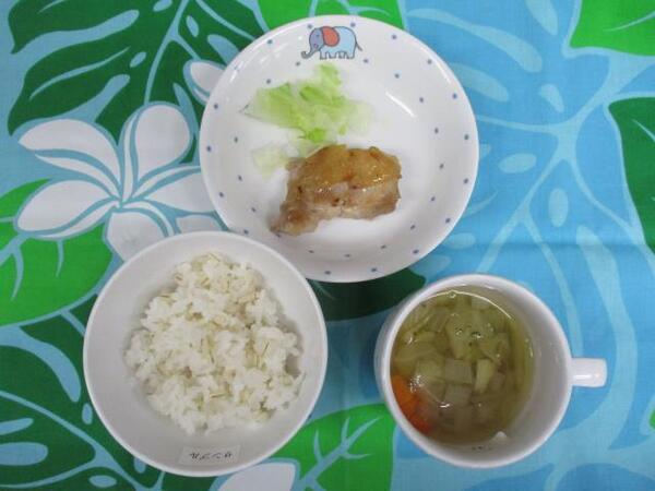 | 〈10時のおやつ〉 ・牛乳🥛 ・キウイ🥝 〈給食〉 ・麦ごはん ・白身魚のケチャマヨソース焼き ・レタス ・豚汁 〈15時のおやつ〉 ・豆乳 ・ココアゼリー(バナナ) |