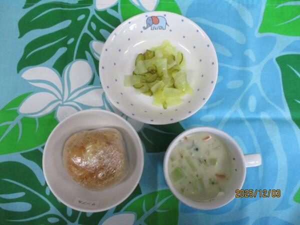 | 〈10時のおやつ〉 ・牛乳 ・みかん🍊 〈給食〉 ・パン ・鶏肉とブロッコリーのクリーム煮 ・きゅうりと大根のカレーマリネ 〈15時のおやつ〉 ・飲むヨーグルト ・きな粉棒 以上児のみ非常用のパンを提供しました。 |