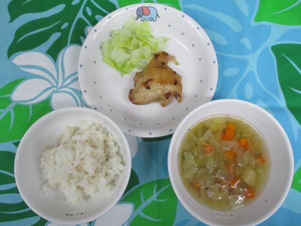 | 〈10時のおやつ〉 ・牛乳🥛 ・オレンジ🍊 〈給食〉 ・麦ごはん ・鶏のマリネ焼き ・レタス ・野菜スープ 〈15時のおやつ〉 ・スキムミルク ・バナナ🍌 ・クラッカー |