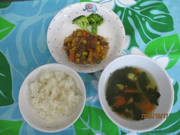 | 〈10時のおやつ〉 ・牛乳🥛 ・バナナ🍌 〈給食〉 ・ミルクパン ・チリコンカーン ・キャベツとコーンの豆乳スープ 〈15時のおやつ〉 ・スキムミルク ・わかめごはん |