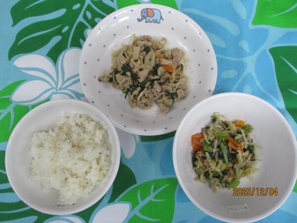 | 〈10時のおやつ〉 ・牛乳🥛 ・パイン缶🍍 〈給食〉 ・麦ごはん ・すまし汁(未満児のみ) ・豚肉のきのこ炒め ・小松菜としらすのごま和え 〈15時のおやつ〉 ・スキムミルク ・みかん🍊 ・ビスケット |