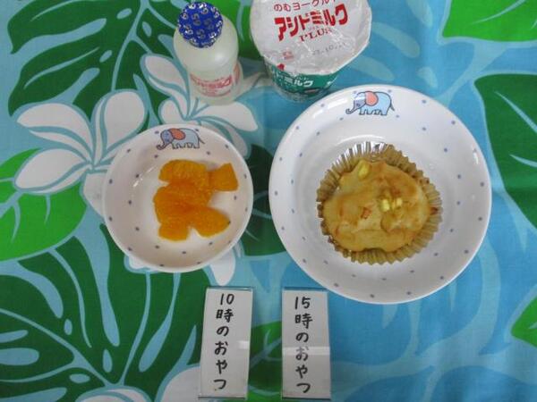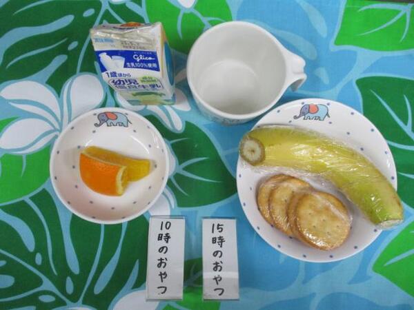 | 〈10時のおやつ〉 ・牛乳 ・せんべい 〈給食〉 ・親子うどん ・バナナ(未満児) ・ヨーグルト(以上児) 〈15時のおやつ〉 ・牛乳 ・バームクーヘン |