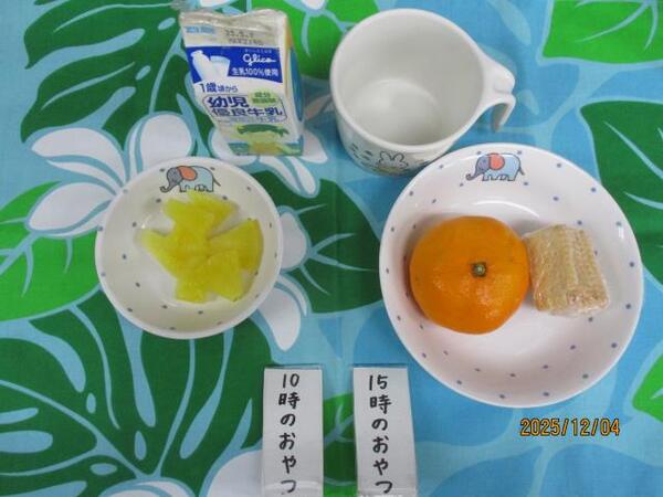 | 〈10時のおやつ〉 ・牛乳🥛 ・ウエハース 〈給食〉 ・汁ビーフン ・ヨーグルト 〈15時のおやつ〉 ・牛乳 ・オレンジ🍊 ・かりんとう |
